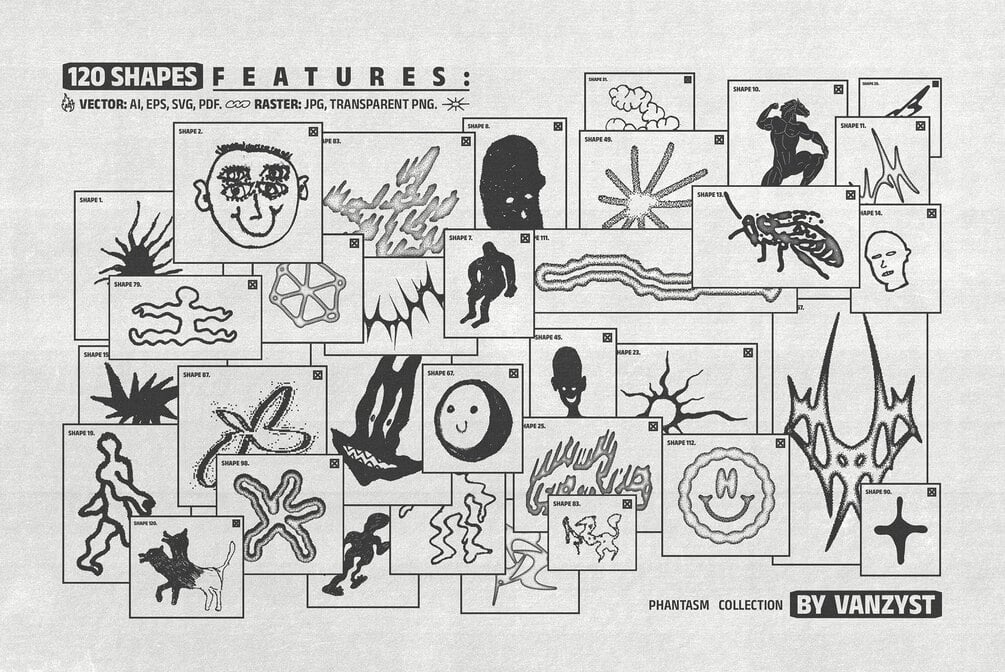 This pack features ✦ 120 unique graphic assets ✦, including pixelated objects, hand-drawn characters, and additional graphic design elements in various styles, which blend together in a bold, acid maximalist way. With this experimental doodle kit, you can create posters, T-shirt designs, music album covers, printed clothing, streetwear fashion, logos, social media posts, and much more.