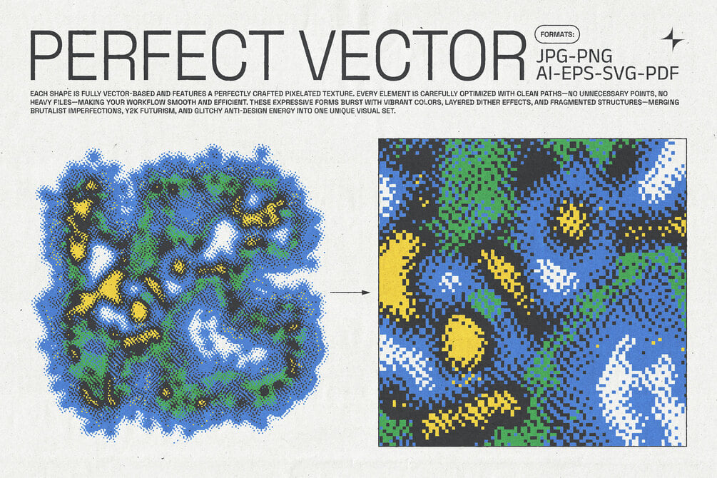 Color Disruptions is a bold collection of 96 abstract vector shapes inspired by pixel art, bitmap textures, and glitch aesthetics. These expressive forms burst with vibrant colors, layered dither effects, and fragmented structures—merging brutalist imperfections, Y2K futurism, and glitchy anti-design energy into one unique visual set.