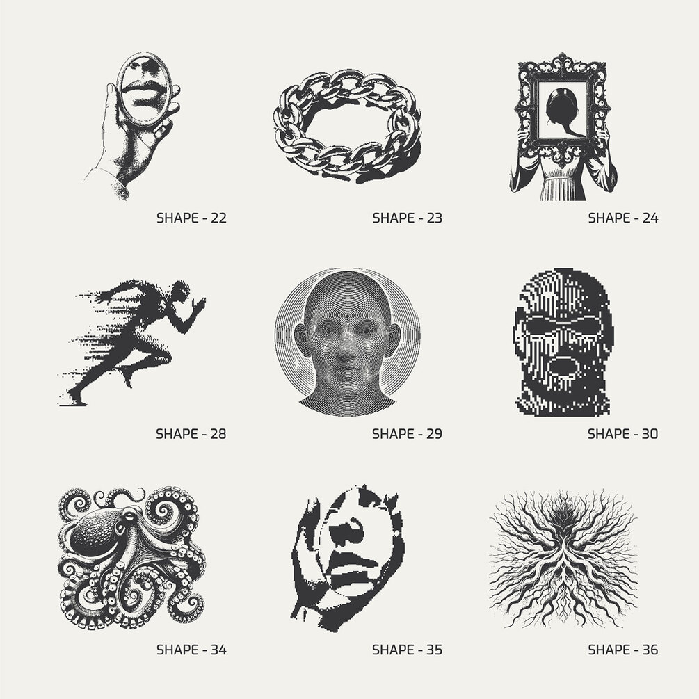 Bitmap, Dither, Pixel Art, Retro, Vintage, Vector Art, Bold Design, Halftone Texture, Abstract, Surreal, Grunge, Sci-fi Aesthetic, Pop Art, Dystopian, Symbolic Icons, High Contrast, Black and White, Collage Art, Album Covers, Poster Art, Packaging, Streetwear Graphics, Edgy Design, Social Media Assets, Stickers, Unique Characters, Quirky Objects, Illustrations, Sci-fi Pop, Retro Futurism, UFO, Alien, Gas Mask, Skeleton, Time, Chains, Frame, Mirror, Wolf, Angel, Octopus, Chair, Car, Trash Bag, Screw, Dinosaur, Disco Ball.