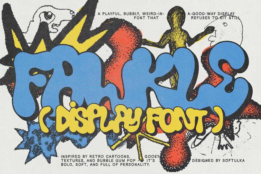 Fawkle is a playful and delightfully odd display font that wiggles, blobs, and bounces with personality. Inspired by retro cartoons, gooey textures, and bubble gum aesthetics, Fawkle adds a splash of surreal fun to any design. Each letter is lovingly distorted with soft, squishy curves and organic shapes — making it perfect for branding, album covers, posters, children’s projects, psychedelic layouts, and anything that craves joyful weirdness.