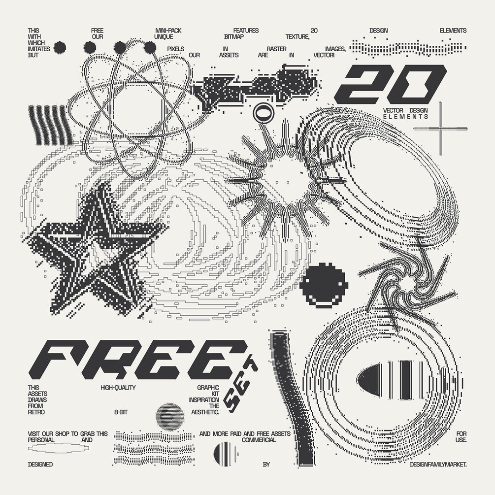 The graphic assets set draws inspiration from the retro 8-bit aesthetic. This free mini-pack features ✦20 pixelated design elements✦ with our unique bitmap texture, which imitates pixels in raster images, but our assets are in vector!