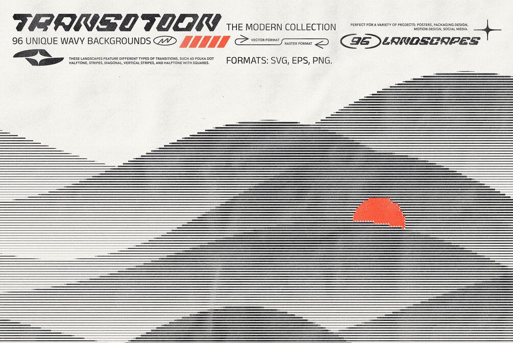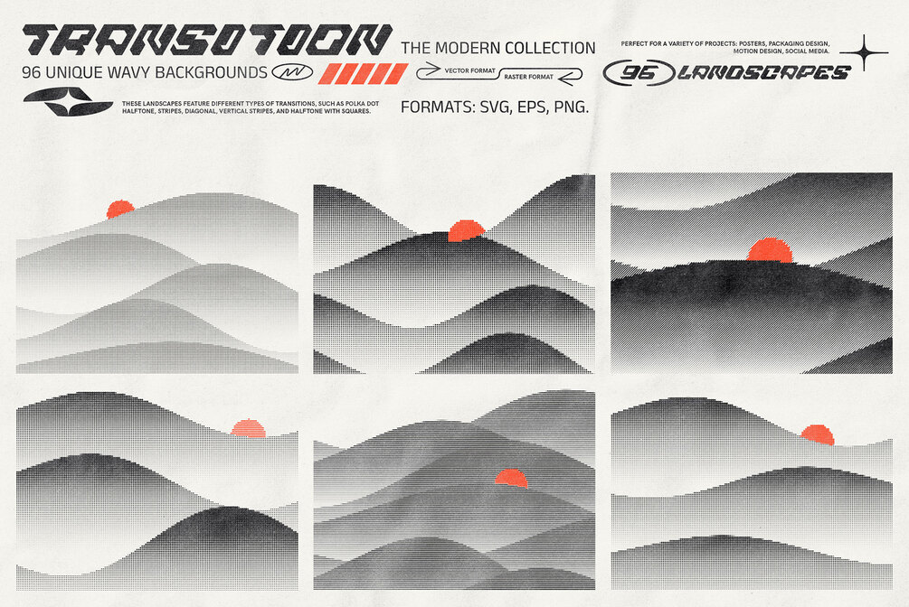 The modern collection of 96 black and white wavy transition backgrounds. These landscapes feature different types of transitions, such as polka dot halftone, stripes, diagonal, vertical stripes, and halftone with squares. The backgrounds are available in both vector and raster formats. Bonus paper textures work great with the transition landscape collection. Easy to use, available in transparent PNG and JPG formats.
