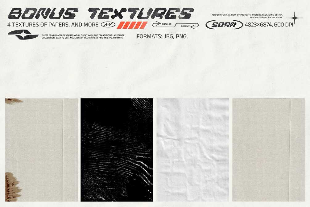 - 4 BONUS paper and plastic textures, 4823x6874px, 600dpi