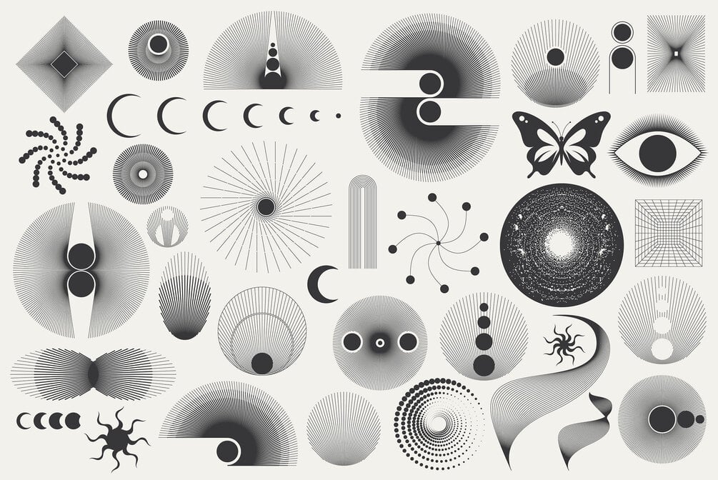 Modern collection with more than 230 universal vector geometric graphic design elements in simple linear style with totally editable strokes, blend option in vector programs like Adobe Illustrator.