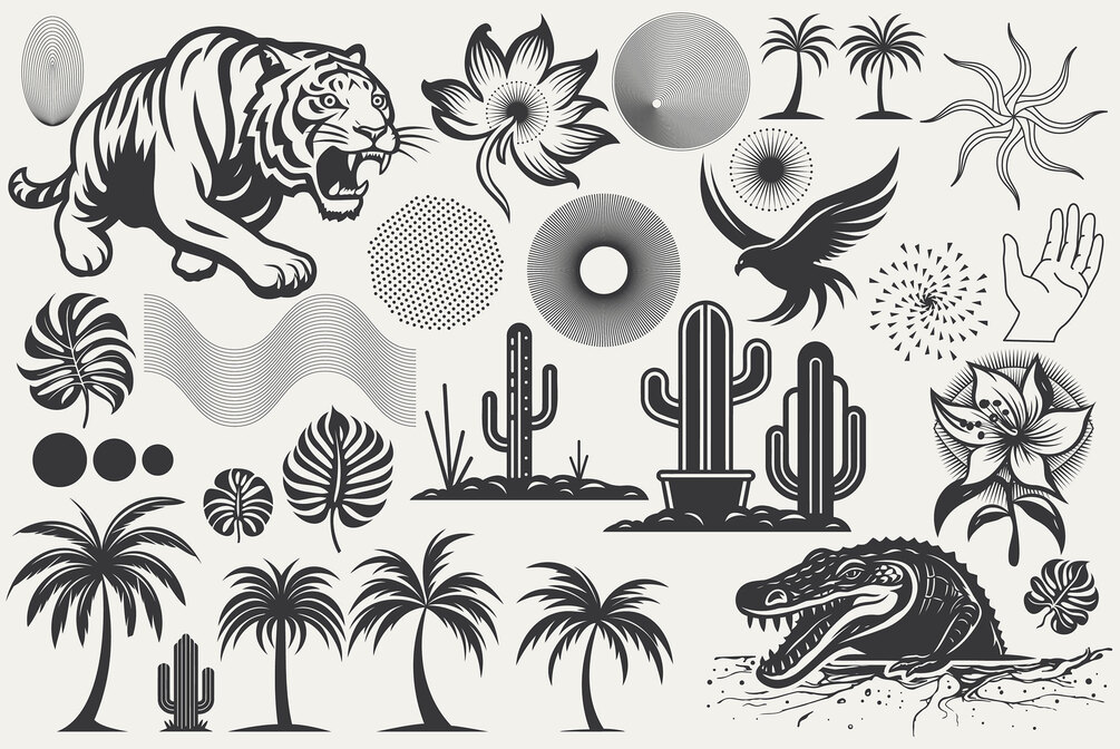 This huge Graphic Bundle contains trendy abstract illustrations, jungle animals, minimal shapes, transitions, and more for creating collages, prints, compositions for wall art, posters, greeting cards, design elements decoration, logo templates, and social media posts.