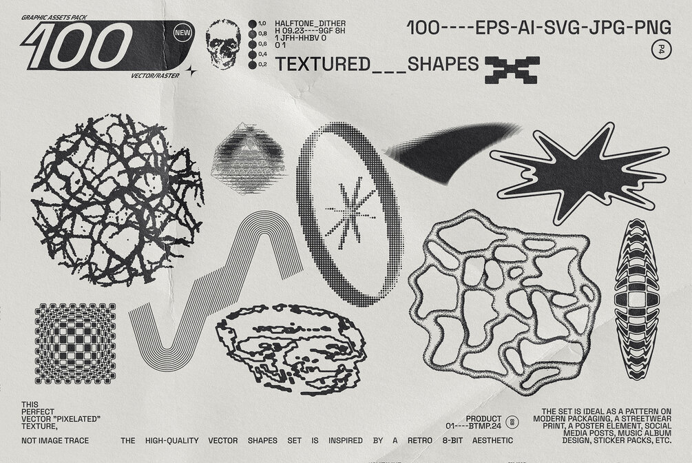 Our creative toolkit with 100 shapes is for people looking for something bold, and underground. It's packed with unique, textured design elements that mimic the look of pixels, organic materials, biological textures, and flowing liquids. Each shape in the set stands out with its own complete, detailed look. You'll find everything in the most widely used digital formats, making it super versatile for any project.