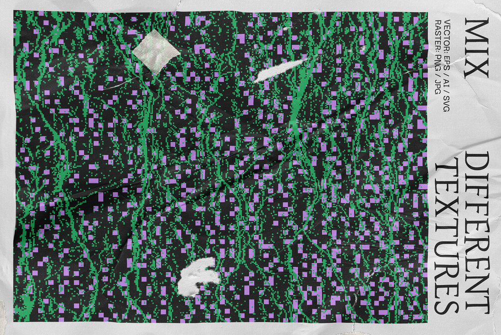 This Grunge Dither collection of backgrounds with halftone transitions has been collected over several years of my travels to different countries around the world. These universal grunge backgrounds have a unique vector "pixelated" texture, NOT image trace. They are perfect as a pattern on modern packaging, a streetwear print, a poster element, social media posts, music album design, sticker packs, or anything where you want to apply a distinctive image. You can easily edit vector files in any vector graphics software. You can recolor, scale, and transform them. Raster files work in any raster (pixel-based) image editing program.